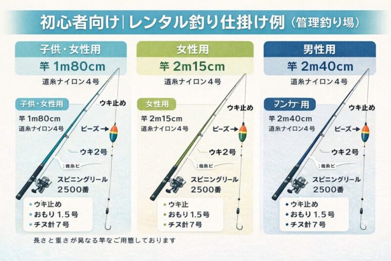 自分のタックル(竿・リールなど)を使う片はレンタルタックルが見本になると思います。