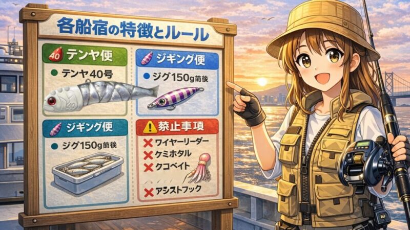 船ごとに細かい決まりがあるため、事前確認が釣果にも直結します。
