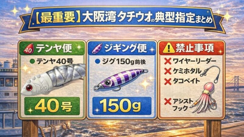 | 大阪湾共通傾向 | 全域 | テンヤ40号文化 | ジグ150g傾向 | イワシ多い | 禁止事項多め |
